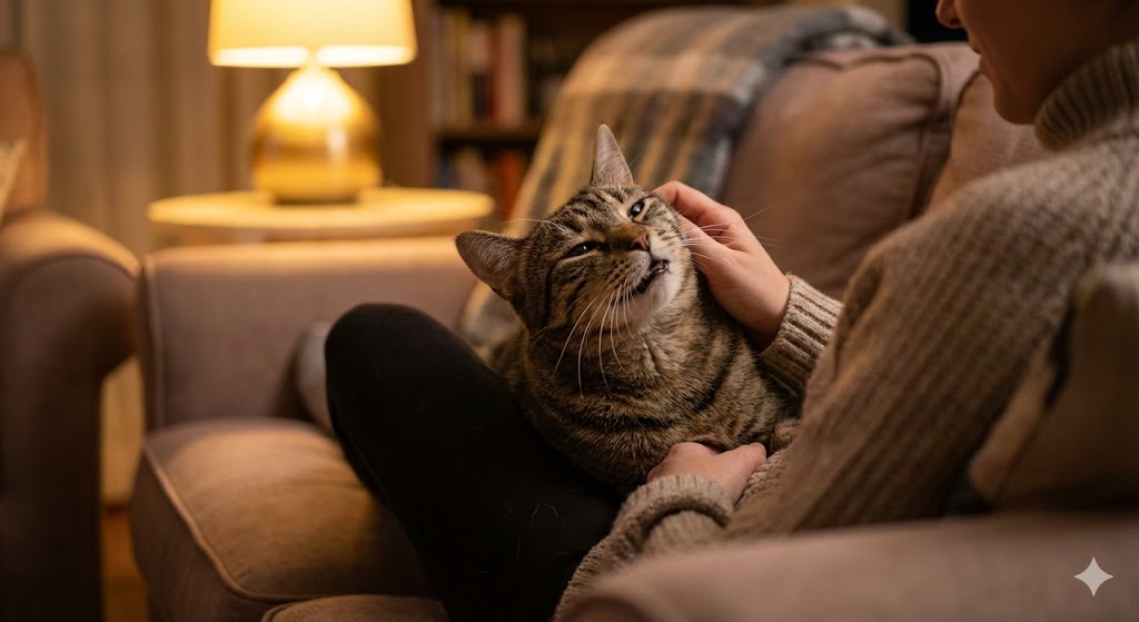 🖼 БЛОК ВИЗУАЛИЗАЦИИ (INLINE): Prompt: . SEO Alt-text: Счастливый полосатый кот мурлычет на руках у хозяина в домашней обстановке Caption: Главное в объятиях — взаимное согласие.